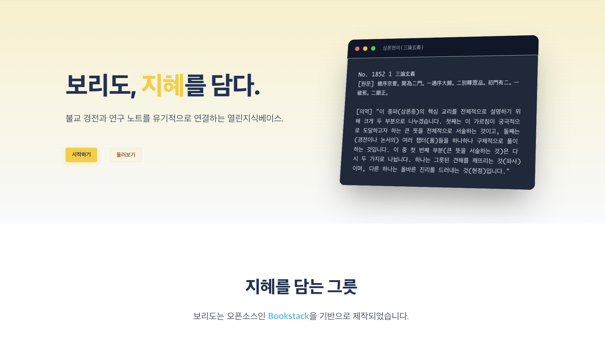 보리도는 방대한 불교 경전과 연구 노트를 유기적으로 연결하고 체계적으로 관리하기 위해 만들어진 **열린지식베이스(Open Knowledge Base)**입니다. '깨달음의 길'을 의미하는 이름처럼, 수행자와 연구자 여러분이 지혜의 바다를 항해하는 데 든든한 등대가 되고자 합니다.